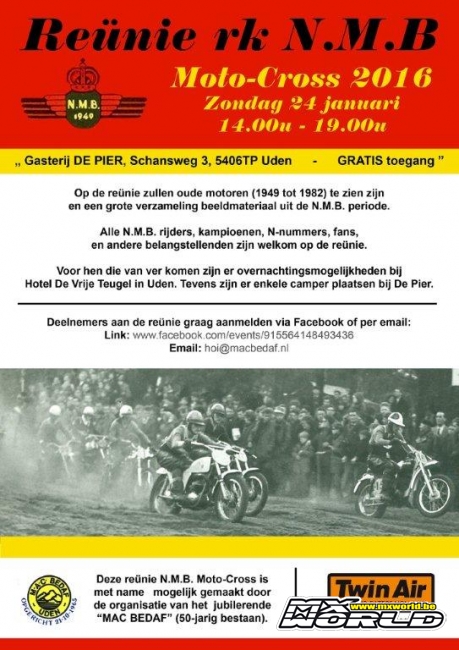 In Nederland is momenteel heel wat te doen rond de NMB, ooit een sterke motorcrossbond in Nederland. Op zondag 24 januari wordt rond deze ex-federatie een Reünie georganiseerd in Uden (NL). Onder meer Gerrit does is de stuwende kracht achter dit verhaal;